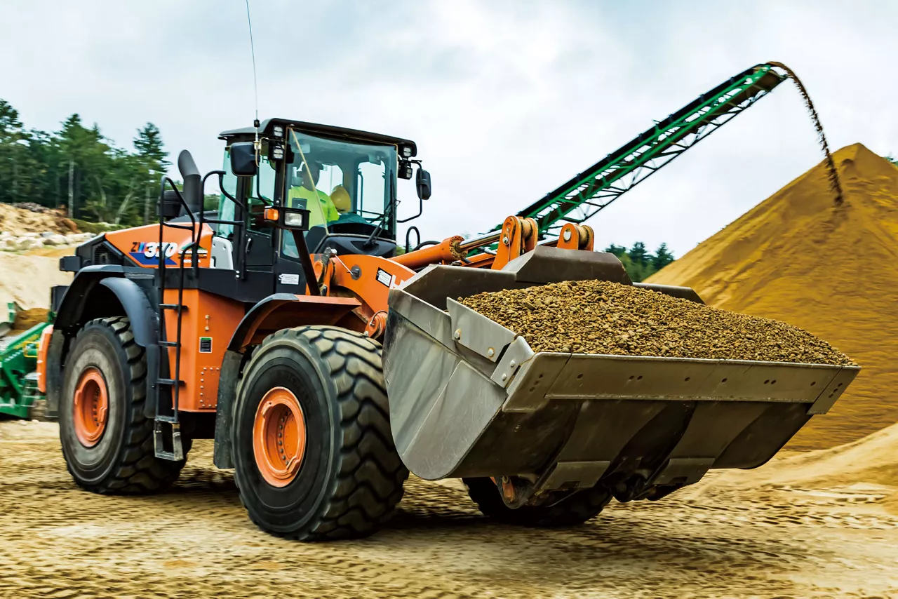 Equipment from Hitachi Construction Machinery plays an active role in excavating and transporting gravel.